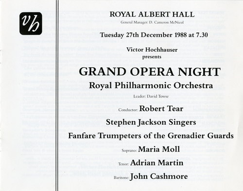 | Set List | 'Overture' from Die Meistersinger, Wagner (Royal Philharmonic Orchestra), Chorus - 'Va Pensiero' from Nabucco, Verdi (Stephen Jackson Singers, Royal Philharmonic Orchestra), Aria - 'Largo al Factotum', from Barber of Seville, Rossini (John Cashmore, Royal Philharmonic Orchestra), Aria - 'Ebben? Ne Andro Lontano' (La Wally), Catalani (Maria Moll, Royal Philharmonic Orchestra), Duet - 'Au Fond Du Temple Saint', from The Pearl Fishers, Bizet (Adrian Martin, John Cashmore, Royal Philharmonic Orchestra), 'Meditation', from Thais, Massenet (Royal Philharmonic Orchestra), 'Three excerpts from La Boheme, Puccini (Maria Moll, Adrian Martin, Royal Philharmonic Orchestra), 'Grand Chorus' from Aida, Verdi (Stephen Jackson Singers, Royal Philharmonic Orchestra) INTERVAL 'Overture' from Hansel and Gretel, Humperdinck (Royal Philharmonic Orchestra), Duet - 'La Ci Darem La Mano', from Don Giovanni, Mozart (Maria Moll, John Cashmore, Royal Philharmonic Orchestra), 'Intermezzo' from Cavalleria Rusticana, Mascagni (Royal Philharmonic Orchestra), 'Toreador's Song' from Carmen, Bizet (John Cashmore, Royal Philharmonic Orchestra), 'Humming Chorus' from Madama Butterfly, Puccini (Stephen Jackson Singers, Royal Philharmonic Orchestra), Aria - 'Un Bel Di' from Madama Butterfly, Puccini (Maria Moll, Royal Philharmonic Orchestra), 'Final Trio and Chorus' from Faust, Gounod (Maria Moll, Adrian Martin, John Cashmore, Stephen Jackson Singers, Royal Philharmonic Orchestra) |