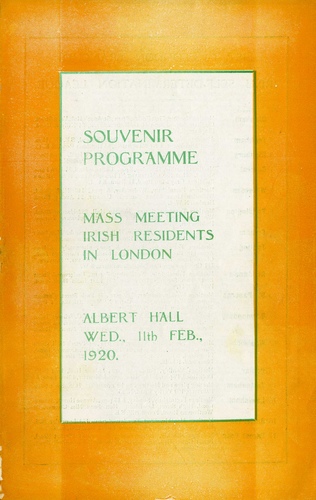 | Performance Notes | "Irish residents in London and sympathisers with the Sinn Fein movement crowded into the Albert Hall last night on the occasion of a mass meeting, arranged by the Irish Self-Determination League of Great Britain, to demand recognition of the Irish Republic. Admission was by ticket, and it was stated that application for seats had been made by 50,000 people. The hall accommodates 10,000 and the great building was filled to overflowing ... While the audience assembled Irish melodies were played on the organ, and at intervals those present rose and sang 'God Save Ireland'. The Sinn Fein colours were displayed on the platform and in many parts of the Hall. Precautions had been taken to deal with any disturbance that might arise, and before the meeting was advanced there was evidence of opposition. At intervals during the proceedings disturbers were removed, and in one or two cases blows were exchanged before the interrupters were unceremoniously bundled out of the hall." (The Times, 12 February 1920)