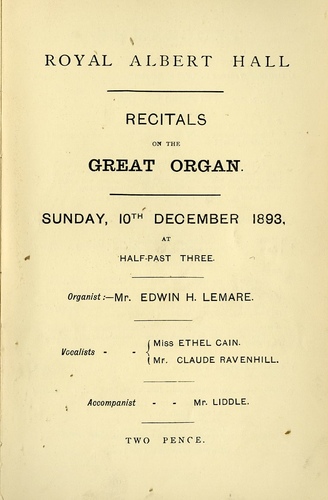 | Main Performers | Miss Ethel Cain, Mr Claude Ravenhill, Edwin H Le Mare - organ |