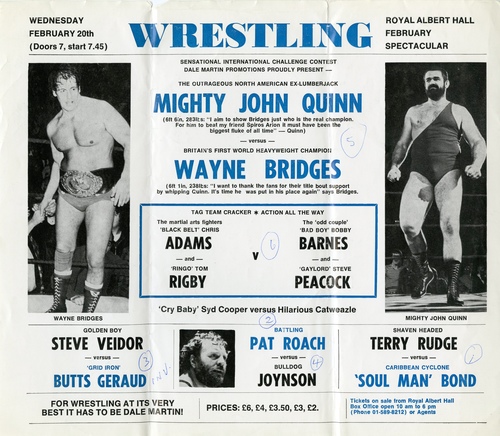| Set List | Heavyweight: Terry Rudge (Dunstable,Beds.) v 'Soul Man' Bond (Jamaica), Catchwieght: Crybaby Cooper (Queensbury, Yorkshire) v Catweazle, Heavyweight: Steve Veidor (Hampton Court) v Butts Giraud (California), Heavyweight: Pat Roach (Birmingham) v Bulldog Joynson (Cheetham, Manchester), Heavyweight: Wayne Bridges v Mighty John Quinn (Canada), Tag Team: 'Ringo' Rigby (Birmingham) and Chris Adams v Bobby Barnes (Maidstone) and Gaylord Peacock |