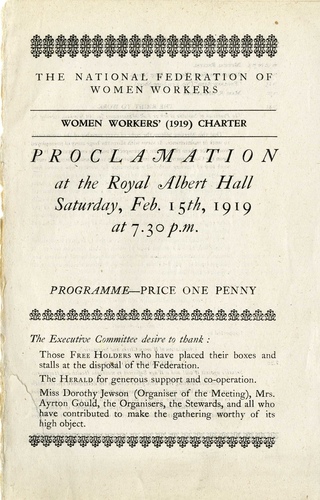 | Performance Notes | "This meeting was called to ask for a charter outlining rates of fair pay and fair conditions of work for Working Women. There is considerable discontent among the demobilized women at what, in women's trade union circles is regarded as an effort to exploit the unemployed women on badly paid domestic service and sweated laundry work, and to mislead public opinion into believing that the out-of-work women who refuse accept £26 or £30 a year for domestic work and 17s or 18s a week in a laundry are having a cheap holiday at the country's expense." (The Times, 20 January 1919)