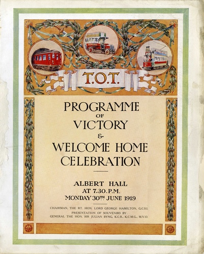 Performance Notes"Union Jacks will be displayed to-day on all the omnibuses, trains, and trams owned by the Underground Railways and alied companies, to commemorate the welcome home celebration which is to be given to the staff at the Albert Hall in the evening. At this celebration General the Hon. Sir Julian Byng will present to the men who have received war decorations [250 men] a parchment as a souvenir of the companies' high esteem of the patriotism. Of the total of 15,979 who have been serving with the colours, just over 9,000 have now been demobilised, and it is expected that the Albert Hall will be crowded from floor to ceiling."