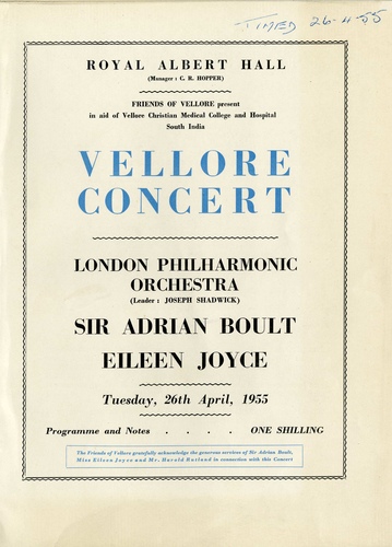 Performance TitleVellore Concert - London Philharmonic Orchestra, Sir Adrian Boult and Eileen Joyce, in aid of Vellore Christian Medical College and Hospital South India