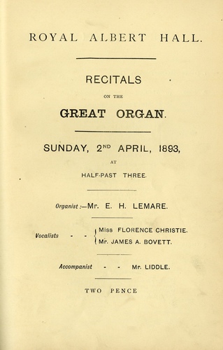 | Main Performers | Miss Florence Christie, James A Bovett - vocals, E H Lemare organ |