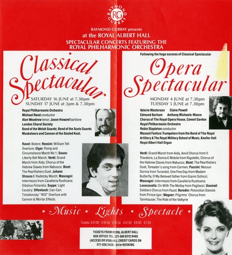 | Set List | 'Overture' from William Tell, Rossini (Royal Philharmonic Orchestra), 'The Liberty Bell March', Sousa (Royal Philharmonic Orchestra), 'Tone Poem 'Finlandia', Op.26', Sibelius (Royal Philharmonic Orchestra), 'Chorus of the Hebrew Slaves 'Nabucco'', Verdi (London Choral Society, Royal Philharmonic Orchestra), Duet from 'The Pearl Fishers', Bizet (Alan Woodrow, Jason Howard, Royal Philharmonic Orchestra), 'Pomp and Circumstance March No.1 in D', Elgar (Royal Philharmonic Orchestra), 'Bolero', Ravel (Royal Philharmonic Orchestra) INTERVAL 'Grand March' from Aida, Verdi (London Choral Society, Royal Philharmonic Orchestra), 'Intermezzo' from Cavalleria Rusticana, Mascagni (Royal Philharmonic Orchestra), 'Light Cavalry Overture', Von Suppe (Royal Philharmonic Orchestra), 'Coronation Anthem' (Zadok the Priest), Handel (London Choral Society, Goldsmiths Choral Union, Royal Philharmonic Orchestra), 'Radetzky March', J Strauss I (Royal Philharmonic Orchestra), 'Can-Can' from Orpheus in the Underworld, Offenbach (Royal Philharmonic Orchestra), '1812 Overture, Op.49', Tchaikovsky (Band of the Royal Artillery, Band of the Corps of Royal Engineers, Musketeers of the Sealed Knot Society, Royal Philharmonic Orchestra) |