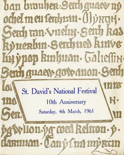 | Set List | Utgyrn (Fanfare) - ''Lord Mayor's', Bryant (Trumpeters of the Life Guards), 'God Save the Queen' (Choirs, Audience), (National Anthem), 'Utgyrn - Cymru ein Gwlad, Cymru a'r Byd', Terry James (Trumpeters, Choirs), 'Nos a Bore', William Mathias (Manselton and District Male Voice Choir), 'Ef yw lili y Dyffrynnoedd (Spiritual)', arr. Emrys Jones (Manselton and District Male Voice Choir), 'Cenwch y Corn (Handel's Judas Maccabbaeus)', arr. Harold Noble (Manselton and District Male Voice Choir), 'Ballet Music (Schubert)', arr. Ernest Read (Bala Primary School Percussion Band), 'March in G (Bach)', arr. S S Moore (Bala Primary School Percussion Band), 'Hwb i'r Galon', arr. Arwel Hughes (The Shelley Singers, Delme Jones), 'Efo Deio i Dywyn', arr. Arwel Hughes (The Shelley Singers, Delme Jones), 'Migildi Magildi', arr. Alwyn Jones (The Shelley Singers, Delme Jones), 'Y Cipar', arr. Cecil Sharp (The Shelley Singers, Delme Jones), Popular Dances of the Walloon Region of Belgium (Compagnie Folklorique Fanny Thibout), 'Jesus of Nazareth', Joseph Parry (Beaufort Male Voice Choir), 'Llanfair PG (John Morgan)', arr. Colin Jones (Colin Jones Quartet), 'Y Barbwr (John Morgan)', arr. Colin Jones (Colin Jones Quartet), 'Emily (John Morgan)', arr. Colin Jones (Colin Jones Quartet), 'Pistyll y Llan', Hen Alaw (Esme Lewis), 'Hen Fenyw Fach Cydweli', trad. (Esme Lewis), 'Lisa Lan', trad. (Esme Lewis), 'Rwy'n Breuddwydio', W S Gwynn Williams (Esme Lewis), 'Castilla', Daniel Protheroe (Pendyrus Male Choir), 'Myfanwy', Joseph Parry (Pendyrus Male Choir), 'Laudamus', Daniel Protheroe (Pendyrus Male Choir), 'Cymru (Alaw: Bro Myrddin)',Gwenalla (Cor Penillion Godre'r Aran), 'Cofio (Alaw: Bedw Gwynion)', Waldo Williams (Cor Penillion Godre'r Aran), 'Hen Gymru (Alaw: Cader Idris)', trad. (Cor Penillion Godre'r Aran), 'Men of Harlech', arr. Terry James (Cardiff School Children), 'Utgyrn - 'The Clock', Waters (Trumpeters of the Life Guards), 'Rhyd y Groes', T D Edwards (Massed Choir, Audience), 'Modryb Neli', arr. E T Davies (The Shelley Singers), 'Dawns y Sipsi', arr. A Hughes (The Shelley Singers), 'Nefoedd', A Hughes (The Shelley Singers), Industry in Wales (Cardiff School Children), 'Martyrs of the Arena', De Rille (Massed Male Voice Choir), Homage to Dylan Thomas (City Of Cardiff College Of Music and Drama), 'Aros Mae'r Mynyddau Mawr', Meirion Williams (Delme Jones), Liege Country Dances of the 18th Century (Compagnie Folklorique Fanny Thibout), 'Eirlysiau (Alaw: Jabez)', Cynan (Cor Penillion Godre'r Aran), 'Psalm 24 (Alaw: Y Ferch o'r Scer)', Y Beibl (Cor Penillion Godre'r Aran), 'Y Glowr (Alaw: Eryri Wen)', G Tilsley (Cor Penillion Godre'r Aran), 'The Masque of Wales, or the Peaceful Battle', Clifford Williams (City of Cardiff College of Music and Drama), 'Milwyr y Groes', Daniel Protheroe (Massed Male Voice Choir), 'Y Delyn Aur', D Pughe Evans (Massed Male Voice Choir), 'Hen Wlad Fy Nhadau' (Massed Choir, Audience) |