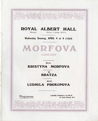 | Set List | Pianoforte Solo: 'Phantasie on Czecko-Slovak Folk-Songs', Smetana, (Ludmila Prokopova), Song: 'The Nymph's Song', Dvorak, (Kristyna Morfova), Song: 'The Lark's Song', Smetana, (Kristyna Morfova), Violin Solo: 'La Folia', Corelli, (Bratza), Concert Aria for Voice and Flute: 'O dolce Concento', Drouet, (Kristyna Morfova, Walter Whitaker), Pianoforte Solo: 'Rhapsody No. 12', Liszt, (Ludmila Prokopova), Czecho-Slovak Folk-Song: 'Nasli jsme se nasli', Kovarovic, (Kristyna Morfova), 'Bulgarian Folk-Song', trad., (Kristyna Morfova), Violin Solo: 'Prelude in E major', Bach, arr. Kreisler, (Bratza), Violin Solo: 'Polacaprice', Dunhill, (Bratza), Aria: 'Bell Song' ('Lakme'), Delibes, (Kristyna Morfova), |