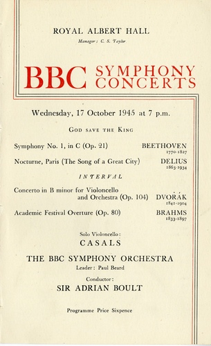 | Set List | 'God Save the King' (The National Anthem), 'Symphony No.1 in C, Op.21', Beethoven, 'Nocturne - Paris' (The Song of a Great City), Delius, 'Cello Concerto in B Minor, Op.104', Dvorak (Casals), 'Academic Festival Overture, Op.80', Brahms |