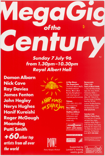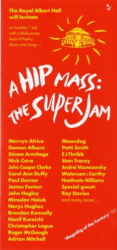 | Main Performers | Heathcote Williams, Valerie Bloom, Ifgenija Simonovic, Mahood Jamal, Kazuko Shiraishi, Brendan Kennelly, Roger McGough, Grace Nichols, Inge Elsa Laird, John Agard, Miroslav Holub, Waterson: Carthy, Carol Ann Duffy, Shusha, Patti Smith, Paul Durcan, Jackie Kay, Gwyneth Lewis, James Fenton, Adrian Mitchell, Patience Agbabi, Andrei Voznesensky, Progress with Zila, Caroline Coon, James Berry, E J Thribb, Perry Benson, Moondog, Nick Cave, Warren Ellis, Christopher Logue, Simon Armitage, Hanif Kureishi, Mark Fisher MP, Nerys Hughes, Gerard Presencer, Fran Landesman, Damon Albarn, Trevor Laird, Michael Horovitz, John Hegley, John Cooper Clarke, Ray Davies, Kylie Minogue - speakers |