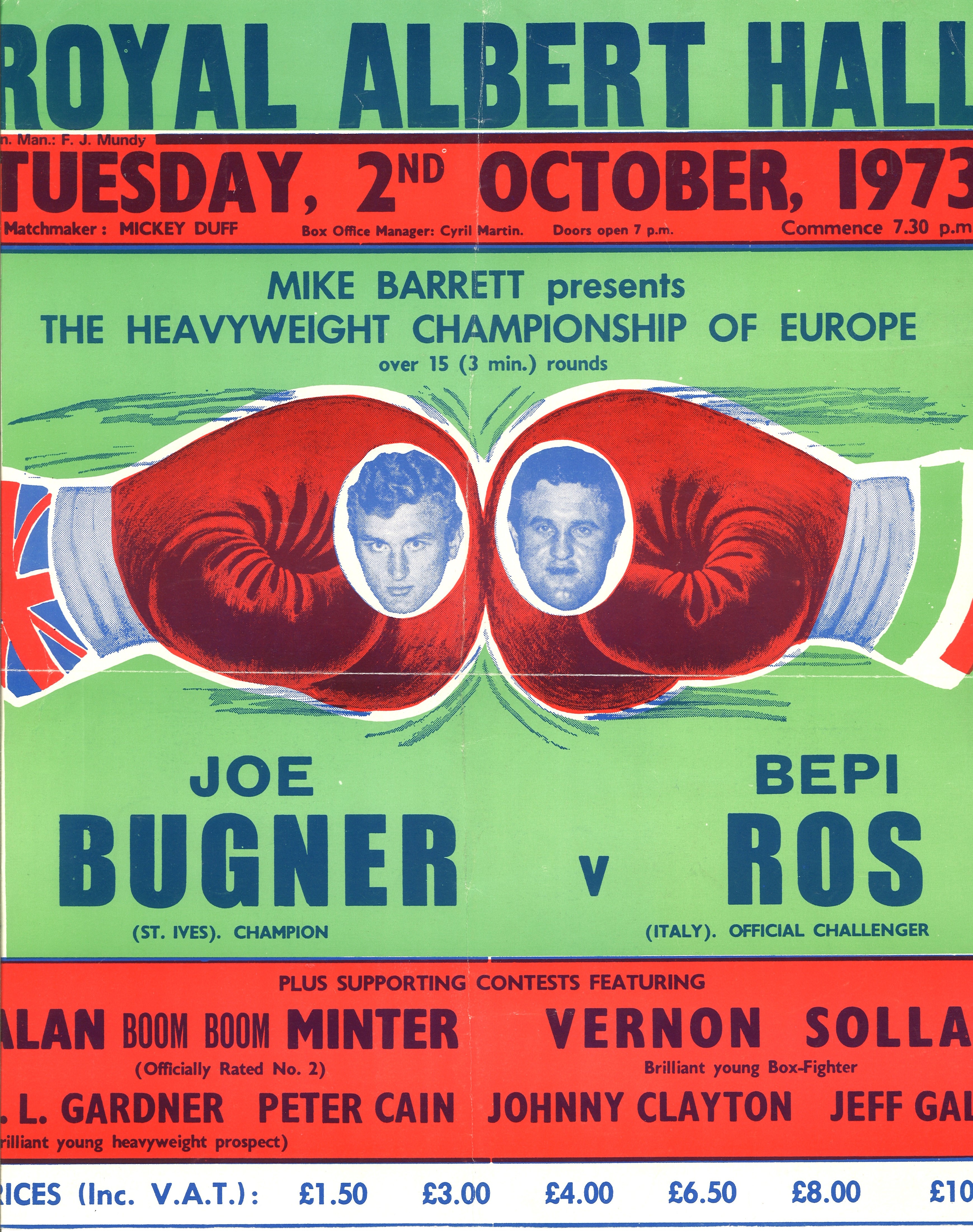 | Set List | Featherweight - Vernon Sollas (Edinburgh) v Bashew Sibaca (South Africa), Heavyweight - John L Gardner (Hackney) v Lloyd Stewart (Sheffield), Heavyweight - Joe Bugner (Cambridgeshire) v Giuseppe 'Bepi' Ros (Italy), Middleweight - Alan Minter (Crawley) v Giovanni Stella (Italy), Middleweight - Jeff Gale (Leeds) v Danny Fearon (Liverpool), Middleweight - Peter Cain (Bethnal Green) v Les Avoth (Cardiff), Lightweight - Johnny Claydon (West Ham) v Joey Lando (Liverpool) |