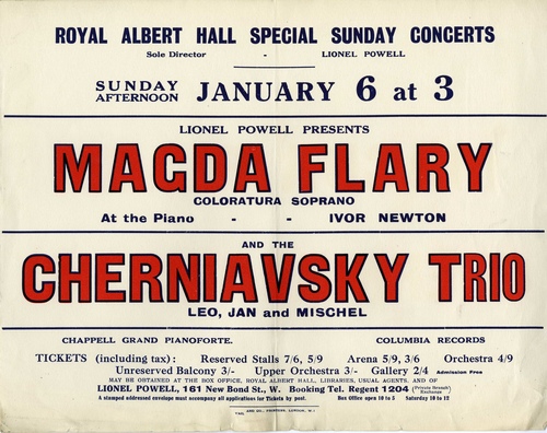 | Set List | Song: 'La Femme Du Soldat', Rachmaninoff (Magda Flary), Aria: 'L'Enigme De La Princesse Cygne' (Tzar Saltan), Rimsky-Korsakoff (Magda Flary), 'Air D'Axana' (La Nuit De Noel), Rimsky-Korsakoff (Magda Flary), 'Trio For Violin,Piano & Cello in D Min, Op.32', Arensky (Cherniavsky Trio), Cavatine: 'Il Barbiere Di Siviglia', Rossini (Magda Flary), 'Grand Air Du Rossignol', Strawinsky, (Magda Flary), 'Variations from Trio for Violin, Piano and Cello in A Minor, Op.50', Tchaikovsky (Cherniavsky Trio), Aria: 'Ombra Legere' (Dinorah), Meyerbeer (Magda Flary), 'Theme and Variations', Proch (Magda Flary) |