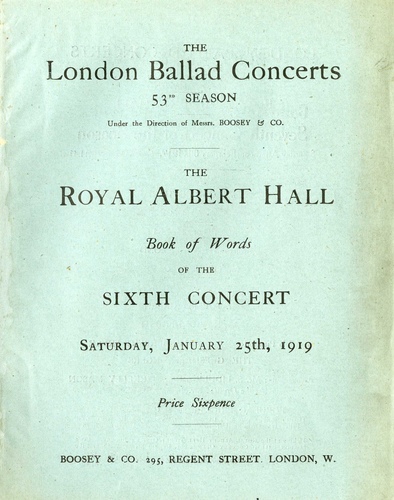 | Set List | Organ Solo: 'Grand Choeur' (No. 2), Hollins (J A Meale), 'Bird of Love Divine', Haydn Wood, 'The Deathless Army', H. Trotere, Bird Songs: ''The Starling, The Wren, The Owl', Liza Lehmann, 'God Is Our Refuge', Lewis Carey, Violin Soli: 'Romance' in F, 'Hungarian Dance' No.7 in A', Beethoven, arr. Brahms:Joachim (Melsa), 'Go to Sea', H. Trotere, 'Love, What Wilt Thou?', 'A Birthday, Hence, away! Begone!', Willie B. Manson, 'The Rose of Perfect Love', Wilfred Sanderson, 'Autumn', C Allison-Crompton, 'Take Pity', Amy Woodforde-Finden, Songs of the Hebrides: 'Milking Croon, Coll Nurse's Lilt' A Fairy's Love Song', Marjorie Kennedy-Fraser INTERVAL Organ Solo: 'Rondo di Campenella', Morandi (J A Meale), 'Solveig's Song', Grieg, 'John of Devon', Sylvia Mortlake, Duets: 'The Echoing Green, Marching Song', A Herbert Brewer, 'One Morning Very Early', Wilfred Sanderson, 'Ships That Pass In The Night', T Wilkinson Stephenson, 'The Fairy Pipers', A Herbert Brewer, Violin Soli: 'Caprice Viennois', Kreisler (Melsa), 'Zapateado', Sarasate (Melsa), 'Tommy Lad', E J Margetson, 'The Splendour of the Morn', Wilfred Sanderson, 'If I Called You Back Someday', Francis Dorel, 'Someday At Last', Wilfred Sanderson, 'Cloze-Props', Charles Wolseley |