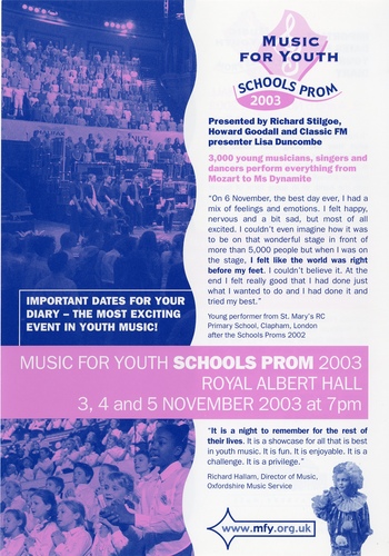 | Set List | 'Fanfare for the Common Man', Copland (Smithills School Senior Brass Band), 'God Save the Queen' (The National Anthem), arr. Wormald (Smithills School Senior Brass Band), 'Fever', Davanport, Holmes (Pembrokeshire Schools' Jazz Ensemble), 'Cute', Hefti, Nestico (Pembrokeshire Schools' Jazz Ensemble), 'Can't Help Lovin' Dat Man' from Showboat, Hammerstein, Kern, Holmes (Pembrokeshire Schools' Jazz Ensemble), 'Finale from Quartet in F Major', Dvorak (Coombs String Quartet), 'Londonderry Air', W McConnell (Coombs String Quartet), 'The Little Red Hen', Patricia Lee (St. Joseph's Little Singers), 'When Father Papered the Parlour', Weston, Barnes (Bute House Lower School Choir), 'In a Dream', A W Bailey (The Falcon Chorale), 'If I Ruled The World' (The Falcon Chorale), 'Mid-Winter', Bob Chilcott (Manor Preparatory Chamber Choir), 'We Are The Future', Douglas Coombes (Trevor Hughes, The Combined Choir), 'Chairs', Percussion School (Percussion School), 'The Dinner', Percussion School (Percussion School), 'The Melody Shop', Karl King, arr. Ray Woodfield (Abraham Darby (AGA) Showband), 'And the Multitude with One Voice Spoke', James L Hosay (Abraham Darby (AGA) Showband) INTERVAL 'March: Lynwood', Ord Hume (Smithills School Senior Brass Band), 'Chorale from Symphony No.3', Mahler, arr. Wormald (Smithills School Senior Brass Band), 'Arrival of the Queen of Sheba', Handel, arr. Sinkler, Edwards (North Tyneside Steel Band), 'Moliendo Cafe', trad., arr. Edwards (North Tyneside Steel Band), ''In the Mood', Garland, Razaf, arr. Edwards (North Tyneside Steel Band), 'Songs from Along Came Man', Linda Marsh, arr. J Stock (Oxfordshire's Young Singers), 'Uh Huh', B2K (3Style), 'It's U', 3Style (3Style), 'Pop Ya Colla', Usher (3Style), 'Overture - Rienzi', Wagner (Surrey County Youth Orchestra), 'Pomp and Circumstance March No.1: Land of Hope and Glory', Elgar (Surrey County Youth Orchestra) |