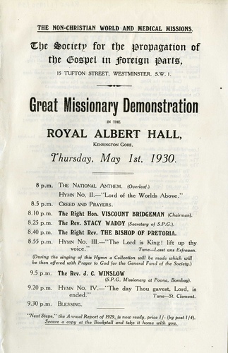 | Main Performers | Rt. Hon.Viscount Bridgeman, Rev. Stacy Waddy, Rt. Rev. the Bishop of Pretoria, Rev. J C Winslow - speakers |