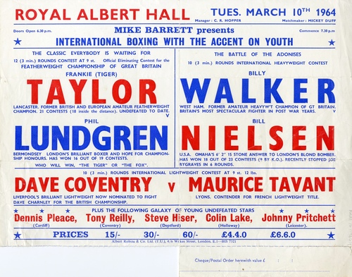 | Set List | Featherweight - Frankie Taylor (Lancaster) v Phil Lundgren (Bermondsey), Heavyweight - Billy Walker (West Ham) v Bill Nielsen (USA), Middleweight - Alf Matthews (Liverpool) v Tommy Hayes (Bristol), Featherweight - Colin Lake (Holloway) v Johnny Ratcliffe (Bournemouth), Middleweight - Johnny Pritchett (Bingham) v Brian Gale (Leeds), Featherweight - Tony Reilly (Coventry) v Neil Hawcroft (Sheffield), Lightweight - Dave Coventry (Liverpool) v Maurice Tavant (France) |