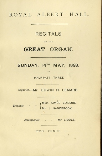 | Main Performers | Miss Aimee Loidore, Mr J Sandbrook - vocals, Edward H Lemare - organ |