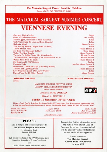 | Set List | Overture: 'Leichte Cavallerie' (Light Cavalry), von Suppe (London Philharmonic Orchestra), Gems of Viennese Operetta - Fall, Strauss, Lehar: 'Dollar Princess', Fall, arr. Tausky (Malcolm Sargent Festival Choir), 'Waltz Dream', Strauss, (London Philharmonic Orchestra), 'Merry Widow', Lehar, 'On My Lips Every Kiss is Like Wine' from Giuditta, Lehar (Josephine Barstow, London Philharmonic Orchestra), 'Girls Were Made to Love and Kiss' from Paganini, Lehar ( Bonaventura Bottone, London Philharmonic Orchestra), 'Radetzky Marsch, Op.228', J Strauss I (London Philharmonic Orchestra), 'You Are My Heart's Delight' from The Land of Smiles, Lehar (Bonaventura Bottone, London Philharmonic Orchestra), 'Tritsch-Tratsch-Polka, Op.214' (Chit Chat), J Strauss II (Malcolm Sargent Festival Choir, London Philharmonic Orchestra), 'My Hero' (The Chocolate Soldier), Strauss (Josephine Barstow, London Philharmonic Orchestra), 'By the Beautiful Blue Danube Waltz, Op.314', J Strauss II (Malcolm Sargent Festival Choir, London Philharmonic Orchestra) INTERVAL 'The Aria for Italian Tenor ' from Der Rosenkavalier, R Strauss, (Bonaventura Bottone, London Philharmonic Orchestra), 'The Marschallin's Monologue ' from Der Rosenkavalier, R Strauss, (Josephine Barstow, London Philharmonic Orchestra), 'Rosen aus den Suden, Walzer, Op.388' (Roses from the South, Waltz), J Strauss II (Malcolm Sargent Festival Choir, London Philharmonic Orchestra), 'My Heart and I ' from Old Chelsea, R Tauber (Bonaventura Bottone, London Philharmonic Orchestra), 'Pizzicato Polka', J Strauss II, Josef Strauss (London Philharmonic Orchestra), 'Introduction, Dance and 'Vilja' from The Merry Widow, Lehar (Josephine Barstow, Malcolm Sargent Festival Choir, London Philharmonic Orchestra), Unter Donner und Blitz, Polka Schnell (Thunder and Lightning, Quick Polka), Op.324, J Strauss II (London Philharmonic Orchestra), 'Love Unspoken' from The Merry Widow, Lehar (Josephine Barstow, Bonaventura Bottone, London Philharmonic Orchestra), 'Einzugsmarsch' (Entrance March) from Der Zigeunerbaron, J Strauss II (Malcolm Sargent Festival Choir, London Philharmonic Orchestra) |