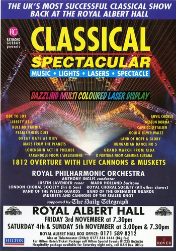 | Set List | 'Mars' from The Planets, Holst (Royal Philharmonic Orchestra), 'The Liberty Bell', Sousa (Royal Philharmonic Orchestra), 'Anvil Chorus' from Il Trovatore, Verdi (Royal Choral Society, Royal Philharmonic Orchestra), 'Hungarian Dance No.5', Brahms (Royal Philharmonic Orchestra), 'The Great Gate of Kiev' from Pictures at an Exhibition, Mussorgsky, Ravel (Royal Philharmonic Orchestra), 'Ode to Joy', Beethoven (Royal Choral Society, Royal Philharmonic Orchestra), 'Duet' from The Pearl Fishers, Bizet (Justin Lavender, Mark Holland, Royal Philharmonic Orchestra), 'Capriccio Italien', Tchaikovsky (Royal Philharmonic Orchestra), 'Pomp and Circumstance March No.1', Elgar (Royal Philharmonic Orchestra) INTERVAL 'Prelude Act III' from Lohengrin, Wagner (Royal Philharmonic Orchestra), 'Farandole' from L'Arlesienne, Bizet (Royal Philharmonic Orchestra), 'Rule Britannia', Arne (Eirian Davies, Royal Choral Society, Royal Philharmonic Orchestra), 'Intermezzo' from Cavalleria Rusticana, Mascagni (Royal Philharmonic Orchestra), 'Grand March' from Aida, Verdi (Royal Choral Society, Royal Philharmonic Orchestra), 'Sabre Dance', Khachaturian (Royal Philharmonic Orchestra), 'O Fortuna' from Carmina Burana, Orff (Royal Choral Society, Royal Philharmonic Orchestra), 'Gold and Silver Waltz', Lehar (Royal Philharmonic Orchestra), 'Nessun Dorma' from Turandot, Puccini (Justin Lavender, Royal Choral Society, Royal Philharmonic Orchestra), '1812 Overture', Tchaikovsky (Band of the Welsh Guards, Band of the Grenadier Guards, Muskets and Cannons of the Sealed Knot, Royal Philharmonic Orchestra) |