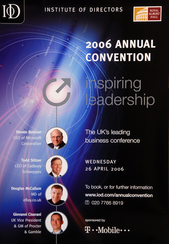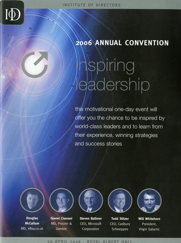 | Main Performers | Miles Templeman (Director General, IoD), Todd Stitzer (CEO Cadbury Schweppes), Steven Ballmer -(CEO Microsoft), David Arkless (VP Manpower), Jim Hyde (UK MD T-Mobile), Trudy Norris-Grey (UK MD Sun Microsystems), Fiona Cannon (Head of Equality and Diversity LloydsTSB Group), Douglas McCallum (UK MD eBay), Will Whitehorn (President Virgin Galactic), Carolyn McCall (CEO Guardian Newspapers), Adam Balon (Co-Founder, Commercial Director Innocent Drinks), Al Gosling (CEO Extreme Group), Caroline Plumb (Co MD FreshMinds), Gianni Ciserani (UK MD Procter and Gamble) - speakers |