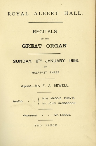 | Set List | Organ: Overture 'Esther', Handel, Song: 'The New Kingdom', B. Tours, Organ: 'Air with Variations, with Final Fughetta in A', Smart, Air: 'How Willing My Paternal' (Samson), Handel, Organ: Pastoral (from Sonata in D Minor), Guilmant, Song: 'Heaven An Earth', Pinsuti, Organ: March 'Schiller', Meyerbeer, Air: 'O God Have Mercy' (St. Paul), Mendelssohn, Organ: 'Fantasia in E flat', Saint-Saens, Organ: '1st Movement from Organ Concerto in F', Handel |