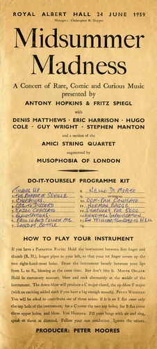 | Main Performers | Hugo Cole, Guy Wright, Stephen Manton - speakers, Denis Matthews, Eric Harrison - pianos, Norman Bagge - street musician |
