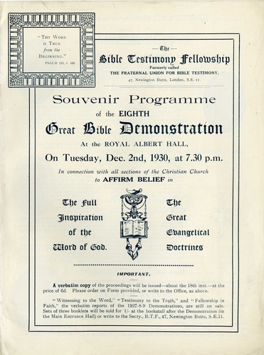 | Main Performers | Rev. D E Hart-Davies, Rev. E C Unmack, Admiral Sir Harry H Stileman, Rev. H Tydeman Chilvers, Sir Ambrose Fleming, Rev. E A Carter, Dr Dinsdale T Young - speakers |