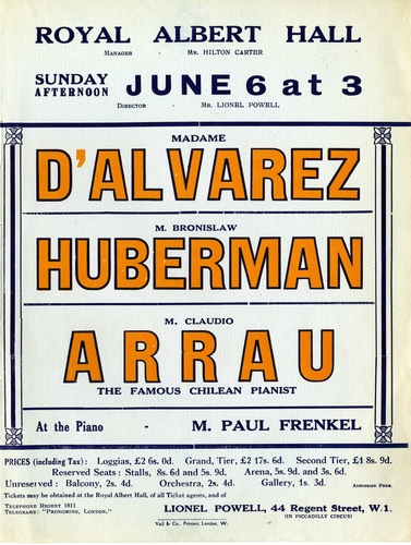 | Main Performers | Madame D'Alvarez - vocal, Bronislaw Huberman - violin, Claudio Arrau - piano |