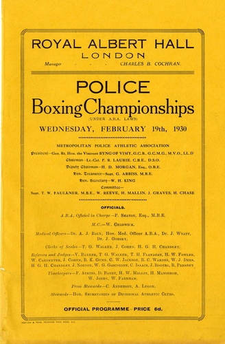| Main Performers | F Cooper, Civiv Guards, Dublin, AThorie, Berlin, L Shipton, Derby Borough, T Dick, 'H' Div.Metropolitan, W Hawkes, 'H' Div.Metropolitan, J Mellish, 'R' Div.Metropolitan, H Ferguson, 'X' Div Metropolitan, R Pautz, Berlin, R Fairgust, Paris, H G Goyder, City of London, J Clark, Colchester Borough, H Bone, 'H' Div.Metropolitan, C Barnes, 'K' Div.Metropolitan, J Santer, 'P' Div.Metropolitan, A Curson, 'V' Div.Metropolitan, J J Chase, Civic Guards, Dublin, W G Blackwell, Civic Guards, Dublin, J Forde, Civic Guards, Dublin, C Gaikowski, Berlin, G Migeon, Paris, J Asling, Boston Borough, T E Wilson, Glamorgan, G W Sewell, City Of London, A D French, Glasgow, E W Egan, 'R' Div.Metropolitan, G A Marlow, 'P' Div.Metropolitan, J W Goyder, City of London, J Murphy, Civic Guards, Dublin, R Hearns, Civic Guards, Dublin, M Wingten, Berlin, A G Longhurst, Winchester City, A Whitbread, Port of London Authority, Rhys Howells, Glamorgan, J Melen, Glamorgan, F Rodda, Nottingham City, F Newell, Colchester Borough, C H Pinch, Essex County, A Jackson, 'S' Div.Metropolitan, G Allen, 'P' Div.Metropolitan, G Carmichael, 'T' Div.Metropolitan, H S Milne, Glasgow, J W Goyde, City of London, A J Clifton, Port of London Authority, C Michaelis, Berlin, J O'Driscoll, Civic Guards, Dublin, M Flanagan, Civic Guards, Dublin, A Sharkey - Civic Guards, Dublin, W A Beby, 'J' Div.Metropolitan, J Titmus, 'A' Div.Metropolitan, T H Smith, 'A' Div.Metropolitan - boxers |