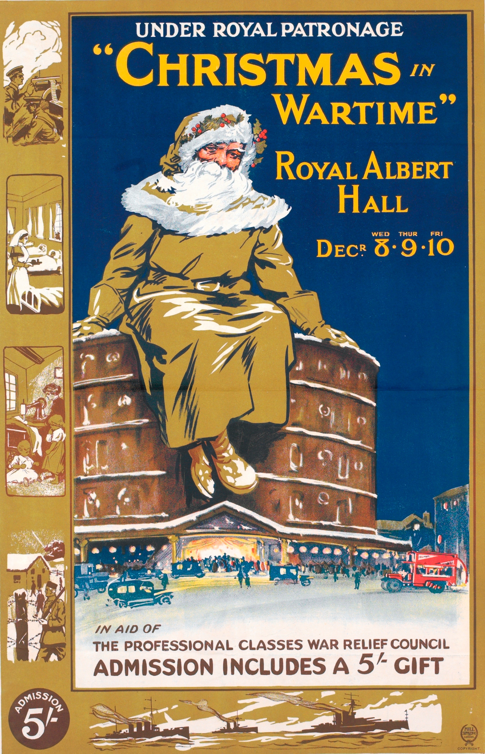"At the Albert Hall yesterday Princess Alexander of Teck, who was accompanied by the Duchess of Albany, opened a monster entertainment called 'Christmas in Wartime'. The affair has been arranged, under the patronage of the Queen, Queen Alexandra, and several other members of the Royal family, in aid of the Funds of the Professional classes War Relief Council. The professional classes have suffered very severely in many cases through the conditions imposed by the war, and it was very pleasant to see so large and clearly generous minded a crowd of people present. But then, charity apart, the Albert Hall is well worth visiting just now for its own sake; and the Christmas in Wartime will have been so widely talked about by now that still larger crowds may be expected there today and to-morrow between the opening at 11 in the morning and the closing at 10 at night. The great floor is covered in stalls and booths full of interesting things to buy and give away for Christmas presents. The colours of the Allied nations decorate the circles ; in the boxes tea may be had, and luncheon and dinner are served at reasonable prices in the gallery. And all the while, besides the buying and selling and so forth, there is music or entertainment of some kind going on. Sketches by Famous Artists - this is the section which contains the most interesting stall in the bazaar - Mrs Ralph Peto's collections of drawings and etchings. There are so many choice things here that it would be well worth the while of connoisseurs and collectors to drop in. Mr John S Sargent has (probably for the first time in his career) given sketches from his sketch book to be sold for the good object. There is a drawing by Burne-Jones. there are specimens of Max Beerbohm, some excellent Orpens', a John, a Walter Bayes; drawings by MacEvoy, Muirhead Bone, Albert Rothenstein, John Nash, Pryde, Ned Yates, Harvard Thomas and many other well known artists." (The Times, 9 December 1915)