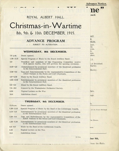 | Performance Notes | 'Christmas in Wartime' in aid of War Relief; divided the hall into sections such as 'Hospital Comforts' - Clothing, Sick Room Furniture, Nurses' Needs; Fighting Forces - Books, Music, Made-Up Parcels for 5 + 10 shillings and £1; Made by the Wounded; British Prisoners of War - Smokes, Edibles and Made-Up Parcels.
