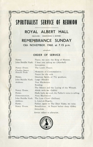 | Set List | Hymn - 'Praise My Soul The King of Heaven', 'I Hear You Calling Me', Marshall (John Heddle Nash), 'Invocation' (Eric W Stuart), 'The Lord's Prayer' (Nancy Evans), 'Sacred Moments' (Charles Smart, Harold Pook), 'A Prayer For The Sick' (Nan Mackenzie), Hymn - 'Gracious Spirit, of Thy Goodness', 'Largo', Handel (John Heddle Nash), Address (Nan Mackenzie), 'The Living Dead' (Eric W.Stuart), 'The Silence and The Laying of The Wreath', 'Abide With Me', Liddle (Nancy Evans), Demonstration (Nora Blackwood), 'The Lost Chord', Sullivan (John Heddle Nash), Address (L Lind-Af-Hageby), Hymn - 'Father! Again To Thy Dear Name We Raise', Benediction - 'A Prayer Before Sleep', Gibbs (Nancy Evans), 'Jerusalem', Parry |