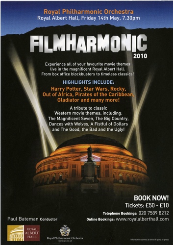 | Set List | 'Gonna Fly Now', B Conti, arr. P Moore, 'Main Theme from The Lord of the Rings: The Fellowship of the Ring', H Shore, arr. N Raine, 'Suite from Pirates of the Caribbean: The Curse of the Black Pearl', K Badelt, arr. C Tin, 'Main Theme from Out of Africa', J Barry, 'Concert Suite from 'Haunted', D Wiseman, 'Wilde West from Wilde', D Wiseman, 'Main Theme from The Good, The Bad and The Ugly', E Morricone, arr. S Brooker, 'Main Theme from The Big Country', J Moross, 'Main Theme from A Fistful of Dollars', E Morricone, arr. B Gascoigne, 'The John Dunbar Theme from Dances with Wolves), J Barry, arr. N Raine, 'Overture from The Magnificent Seven', E Bernstein, arr. P Bateman INTERVAL 'Raiders March and End Credits from Indiana Jones: Raiders of the Lost Ark, J Williams, 'I See You from Avatar', J Horner, orch. C Bradley, 'Leaving Forever from Last of the Dogmen', D Arnold, 'A Night at the Opera from Quantum of Solace', D Arnold, arr. N Dodd, 'You Know My Name from Casino Royale', D Arnold, C Cornell, arr. N Dodd, 'Main Theme from Ghostbusters, R Parker Jr., arr. Mike Townend, 'Main Theme from Gladiator', H Zimmer, L Gerrard, arr. N Raine, 'Main Theme from Star Wars', J Williams, 'Impossible Opening from Finding Neverland', J A P Kaczmarek, arr. C Tin, 'Hedwig's Theme from Harry Potter and the Philosopher's Stone, J Williams, 'End Credits from Jurassic Park', J Williams ENCORE 'Peter Gunn Theme', Mancini |