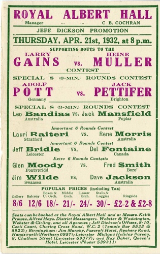 | Set List | Larry Gains v Heine Muller, Adolf Pott (Germany) v Jack Pettifer (Brighton), Leo Bandia (Australia) v Jack Mansfield (Poplar), Lauri Raiteri (Startford) v Rene Morris (Australia), Jeff Bridle (Leicester) v Del Fonatine (Canada), Glen Moody (Pontyprodd) v Fred Smith (Boro'), Jim Wilde (Swansea) v Dave Jackson (Australia) |