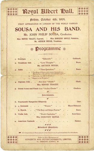 | Set List | 'Overture' from Tannhauser, R Wagner, arr. J P Sousa, 'Cornet Solo', H L Clarke, 'The Bride of the Waves, Clarke, Scenes Historical, 'Sheridan's Ride', Sousa, words for Waiting for the Bugle; The Attack; The Death of Thoburn; the Coming of Sheridan; the Apotheosis, Soprano Solo, Aria from Alceste, Gluck (Miss Minnie Tracey), Grand Scene 'Knights of the Holy Grail' from Parsifal, R Wagner, INTERVAL 'The Preludes', F Liszt, Valse 'Rose Mousse' - Bosc March 'The Invincible Eagle', J P Sousa (premiere), Violin Solo (Miss Dorothy Hoyle), 'Ziguenerweisen', P Sarasate Introduction to third Act of 'Lohengrin', R Wagner |