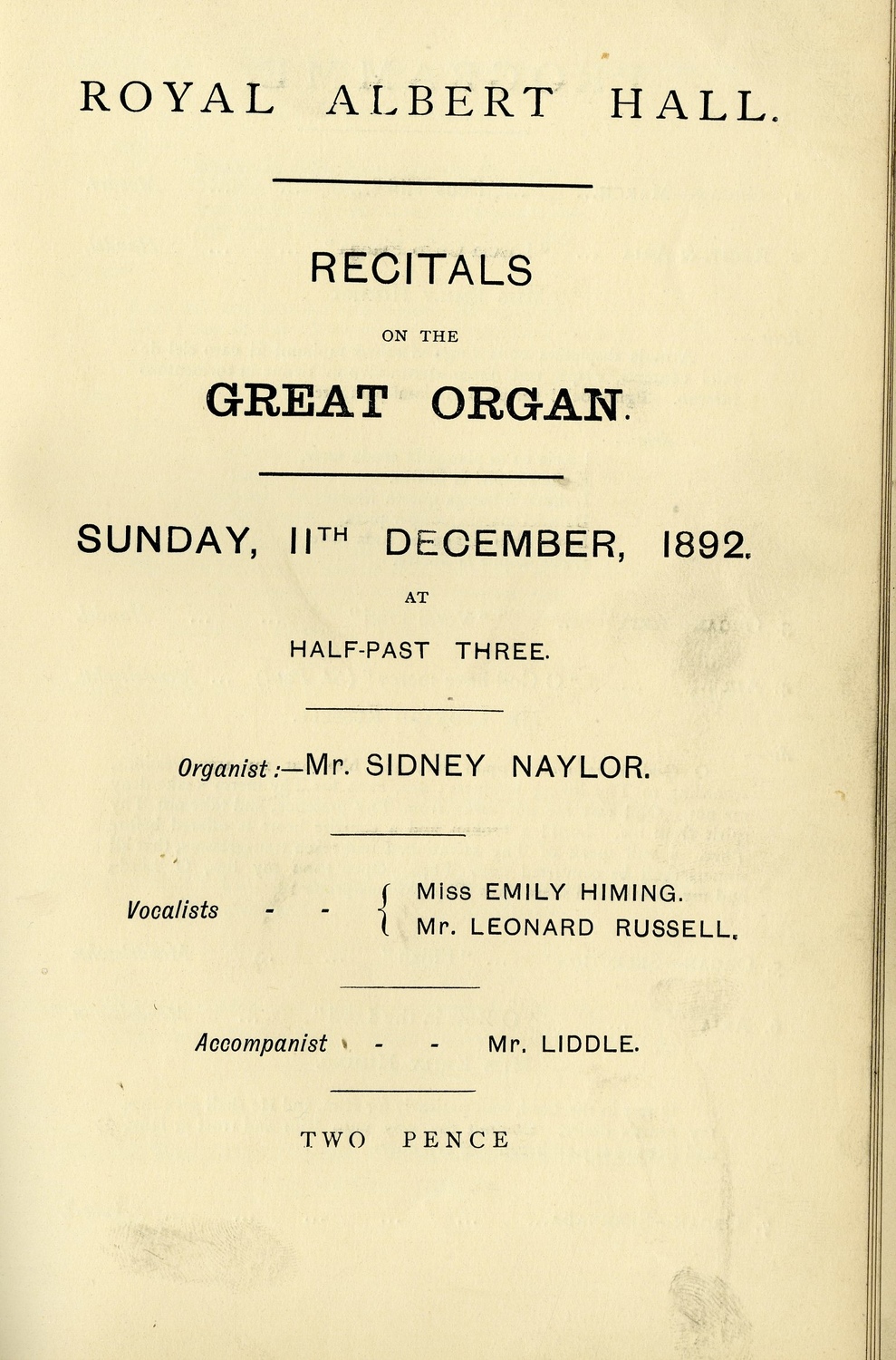 | Main Performers | Miss Emily Himing, Mr Leonard Russell - vocals, Sidney Naylor - organ |