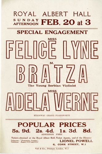 | Main Performers | Felice Lyne - vocal, Bratza - violin, Adela Verne - pianoforte |