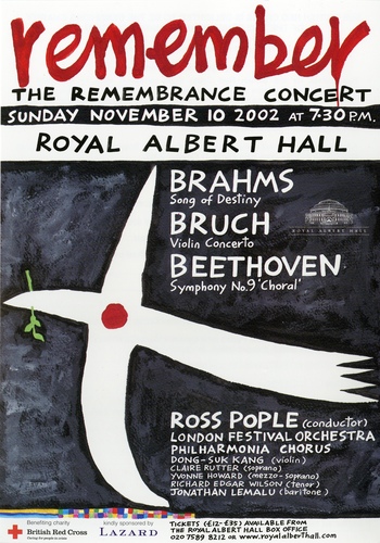 | Set List | 'Song of Destiny, Op.54', Brahms (The Philharmonia Chorus, London Festival Orchestra), 'Violin Concerto in G Minor, Op.26', Bruch (Dong-Suk Kang, London Festival Orchestra) INTERVAL 'Symphony No.9 in D Minor, Op.125', Beethoven (Claire Rutter, Yvonne Howard, Richard Edgar-Wilson, Jonathan Lemalu, The Philharmonia Chorus, London Festival Orchestra) |