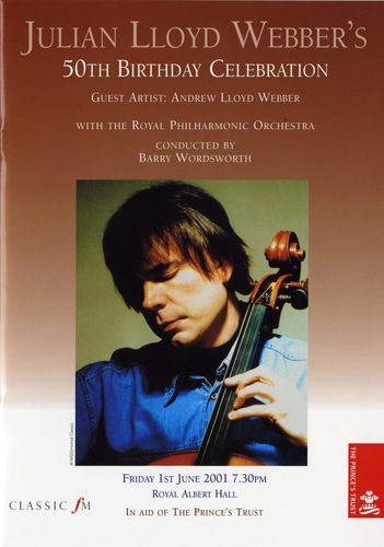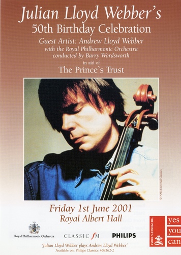 | Set List | 'Invocation', William Lloyd Webber (Royal Philharmonic Orchestra), 'Cello Concerto', Elgar (Julian Lloyd Webber, Royal Philharmonic Orchestra), 'John 19:41' from Jesus Christ Superstar, Andrew Lloyd Webber, arr. Cullen (Royal Philharmonic Orchestra) INTERVAL 'Invocation', Holst (Royal Philharmonic Orchestra), 'Aurora', William Lloyd Webber (Royal Philharmonic Orchestra), 'All I Ask of You' from Phantom of the Opera, Andrew Lloyd Webber, arr. Cullen (Royal Philharmonic Orchestra) 'I Don't Know How to Love Him' from Jesus Christ Superstar, Andrew Lloyd Webber, arr. Cullen (Royal Philharmonic Orchestra) 'Music of the Night' from Phantom of the Opera, Andrew Lloyd Webber, arr. Cullen (Royal Philharmonic Orchestra) 'Theme and Variations 1-4 and Variation 23', Andrew Lloyd Webber, arr. Cullen (Julian Lloyd Webber, Royal Philharmonic Orchestra), 'Jackie's Song', Julian Lloyd Webber (Julian Lloyd Webber, Royal Philharmonic Orchestra) |