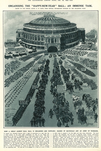 'White marble, silver, and gold are to be the dominant notes in the decoration of the hall. The great organ will be hidden by a back-cloth designed by Philip Connard ARA... The boxes, wehich are, of course, in harmony with the Ventian scheme, will this year be curtained in red and white. Cone-shaped containers, full of balloons, will be hung from the roof, and every now and again they will empty their gay contents, like multi-coloured bubbles, over the dancers." (The Daily Telegraph, 10 December 1924)