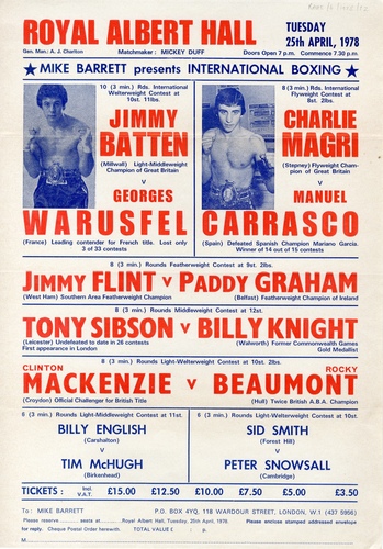| Main Performers | Featherweight - Jimmy Flint (West Ham) v Paddy Graham (Belfast), Middleweight - Tony Sibson (Leicester) v Mac Nicholson, Welterweight - Jimmy Batten (Millwall) v Georges Warusfel (France), Flyweight - Charlie Magri (Stepney) v Manuel Carrasco (Spain), Light-Welterweight - Clinton Mackenzie (Croydon) v Chris Davies (Cardiff), Light-Middleweight - Billy English (Carshalton) v Tim McHugh (Birkenhead), Light-Welterweight - Sid Smith (Forest Hill) v Steve Ward |