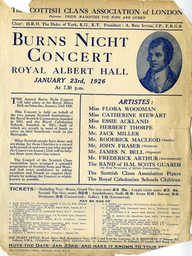 | Set List | Organ Solo: 'Scottish Fantasia', arr. A L Peace (James N Bell), Scottish Clans Association Pipers, Bagpipe Selections: March 'KOSB Farewell to Meerut', Strathspey 'Lady Louden', Reel 'The Kilt Is My Delight', Overture: 'The Land of the Mountain and the Flood', Hamish MacGunn (Band of H.M.Scots Guards), Song: 'Hail.Caledonia!', Hugh Ogilvie, Essie Ackland Songs: 'Cumha Mhic Criomain' (Roderick MacLeod), 'Mairi Laghach' (Roderick MacLeod), Royal Caledonian Schools' Children, Bagpipe Selections: March 'Murray's Welcome', Strathspey 'Aberlour House', Reel 'The De'il Among the Tailors', March 'The Siege of Delhi', Song: 'A Highland Lad My Love Was Born', Burns (Flora Woodman), Organ Solo: 'Overture to the Hebrides', Mendelssohn (James N Bell), Song: 'A Man's A Man For A' That', Burns (Jack Miller), Violin Selection: 'Lochnagar', W F Hartley (John Fraser), Songs: 'Caller Herrin', Baroness Nairne (Catherine F.Stewart), 'Gae Bring Tae Me A Pint O' Wine', Burns (Herbert Thorpe), 'My Nannie's Awa', Burns (Herbert Thorpe), Cornet Solo: 'Mary', Richardson (Corporal J Hudson), Organ Soli: 'Finale in B Flat', Cesar Franck (James N Bell), 'Finlandia', Sibelius (James N Bell), Royal Caledonian Schools' Children, Bagpipe Selections: March 'The Barren Rocks of Aden', Strathspey 'Lady Madelina Sinclair', Reel 'Miss Girdle', March 'Highland Laddie', Selection: 'The Thistle', Myddleton (Band of HM Scots Guards), Songs: 'The Rowan Tree', Baroness Nairne (Catherine F. Stewart), 'My Ain Kind Dearie O', Burns (Herbert Thorpe), Scottish Clans Association Pipers Bagpipe Selections: March 'Corn Riggs', Strathspey 'Bob of Fettercairn', Reel 'High Road to Linton', Dance 'Highland Reel', Songs: 'Gala Water', Burns (Essie Ackland), 'There Was A Lad Was Born In Kyle', Burns (Essie Ackland), 'Scots Wha Hae', Burns (Jack Miller), Violin Selection: 'A Highland Legend', A. Moffat (John Fraser), 'Gay Gordons', (John Fraser), 'The Laird o' Thrums', (John Fraser), 'The Mason's Apron', (John Fraser), Duet: 'Crookit Bawbee', M.T.A., (Catherine Stewart, Herbert Thorpe), Songs: 'An Eriskay Lullaby', Marjory Kennedy-Fraser (Flora Woodman), 'Tam Glen' (Flora Woodman), 'Cead-Deireannach Nam Beann' (Roderick MacLeod), Selection: 'Fantasia on Scottish Songs', D Stephen (Band of HM Scots Guards), 'Auld Lang Syne' 'God Save the King' (The National Anthem) |