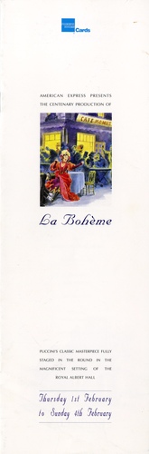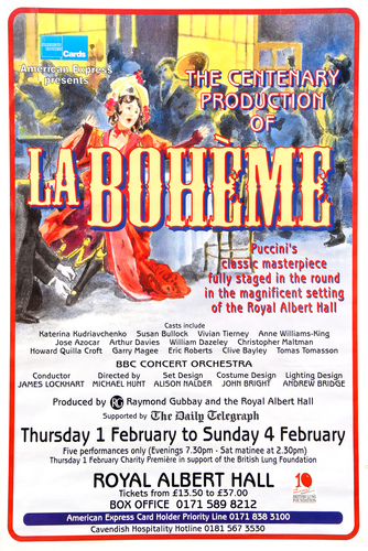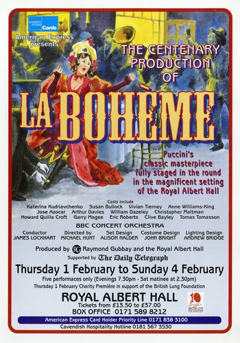Performance NotesThe 1 February 1996 marked the centenary of Puccini's classic opera 'La Boheme' and the Royal Albert Hall played host to this in-the-round production to commemorate.