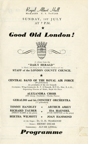 | Set List | Prologue, 'Sing a Song of London', Kennedy, Carr (Alexandra Choir, Geraldo and His Concert Orchestra), Overture, 'Cockaigne', Elgar (Geraldo and His Concert Orchestra), Arias, 'O, I Entreat Thee, Sire' from Turandot, Puccini (Joan Hammond, Geraldo and His Concert Orchestra), 'Love and Music' from Tosca, Puccini, (Joan Hammond, Geraldo and His Concert Orchestra), Intermezzo, 'Westminster' (London Suite), Coates (Central Band of the Royal Air Force), Chorus, 'The British Grenadiers', arr. Stanford-Robinson (Alexandra Choir, Geraldo and His Concert Orchestra, Central Band of the Royal Air Force), 'My Heart And I' (Old Chelsea), Tauber (Richard Tauber), 'Whisperings From The Vienna Woods', J Strauss-Korngold (Richard Tauber), 'Holiday for Strings', David Rose (Geraldo and His Concert Orchestra), Violin Soli, 'Ave Maria', Schubert (Ida Haendel), 'Scherzo Tarantelle', Wieniawski (Ida Haendel), March, 'Scipio', Handel (Central Band of the Royal Air Force), Choruses, 'England', Parry (Alexandra Choir, Geraldo and His Concert Orchestra), 'Non Nobis', Roger Quilter (Alexandra Choir, Geraldo and His Concert Orchestra), 'Warsaw Concerto' (Danerous Moonlight), Richaard Addinsell (Geraldo and His Concert Orchestra), Selection, 'You Were Never Lovelier', Jerome Kern (Carole Carr, Len Camber, Geraldo and His Concert Orchestra), 'London Pride', Noel Coward (Harry Hudson, Geraldo and His Concert Orchestra), 'There'll Always Be An England', Ross Parker, Hughie Charles (Alexandra Choir, Geraldo and His Concert Orchestra, Central Band of the Royal Air Force), 'Knightsbridge March' (London Suite), Coates (Central Band of the Royal Air Force), 'London' (The Holocaust), Henry Oscar, Chorus , 'Land of Hope and Glory', Elgar (Joan Hammond, Alexandra Choir, Geraldo and His Concert Orchestra, Central Band of the Royal Air Force), 'God Save the King' (The National Anthem) |