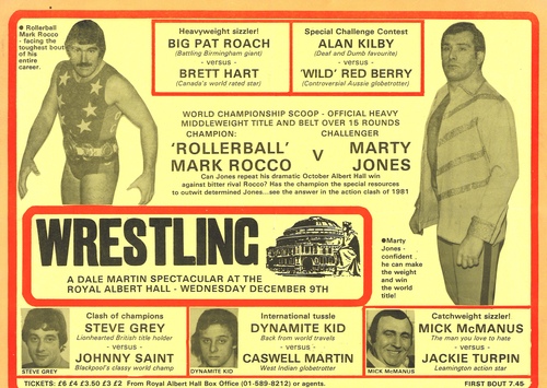 | Set List | Middleweight - Mick McManus (New Cross) v Jackie Turpin (Leamington Spa), Middleweight - Caswell Martin (St. John, Antigua) v The Dynamite Kid, Tommy Billington, Heavyweight - Big Pat Roach (Birmingham) v Brett Hart (Calgary, Alberta), Heavy Middleweight - Rollerball Mark Rocco (Manchester) v Marty Jones (Oldham), Lightweight - Johnny Saint (Blackpool) v Steve Grey, Catchweight - Alan Kilby v 'Wild' Red Berry (Alice Springs, Australia) |