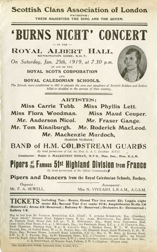| Set List | Organ Recital (F A Sewell), Bagpipe Selections: March: 'Corn Riggs', Strathspey: 'Miss Drummond of Perth', Reel: 'Lochtay Side', 'Gae, Bring Tae Me A Pint O' Wine', Burns (Tom Kinniburgh), 'Caller Herrin', Nathaniel Gow (Phyllis Lett), Gaelic Songs: 'Mo Shuil a' d' Dheigh', Spedding (Roderick MacLeod), 'Cabar Feidh', Baptie (Roderick MacLeod), Recitation:'The Sodgers Return', Burns (Maud Couper), Violin Solo:'Robin Adair' (Fantasia), Murdoch (Mackenzie Murdoch), 'Ae Fond Kiss', Burns (Anderson Nicol), 'Draw the Sword, Scotland', J.R. Planche (Carrie Tubb), 'Scots, Wha hH'e', Burns (Fraser Grange), Dance: 'Reel O' Tulloch' (Ena Gourlay, Mary Rawson, Colin Wright, Harry Crompton), 'Ye Banks and Braes', Burns (Flora Woodman), 'Mary of Argyll', Nelson (George Morgan), Band Selection: 'Reminiscences of Scotland', Mr. Fred Godfrey, 'O' A' The Airts', Burns (Anderson Nicol), 'Annie Laurie', Burns (Phyllis Lett), 'The Wedding of Shon MacLean', Burns (Tom Kinniburgh), Dance: 'Highland Fling', Burns (Ena Gourlay, Mary Rawson, Colin Wright, Harry Crompton), 'A Highland Lad My Love Was Born', Burns (Flora Woodman), 'The Land O' the Leal', Baroness Nairn (Fraser Grange), 'O Whistle, And I'll Come To You', Burns (Carrie Tubb), Violin Solo: 'Mauchline', Burns (Mackenzie Murdoch), Recitation: 'Scotty', Burns (Maud Couper), Gaelic Song: 'An Gleann 'San Robh Mi Og', Baptie (Roderick MacLeod), 'Keltic Suite', Foulds (Roderick MacLeod), March: 'For Scotland and the King', Carl St. Amory (Roderick MacLeod) |