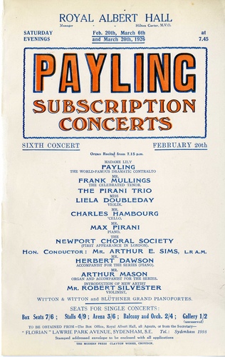 | Set List | Organ Soli: 'Marche Pontificale', Widor (Herbert Dawson), 'Intermezzo' (Founded on an Irish Air), Stanford (Herbert Dawson), 'Prelude and Fugue in G Minor', Bach (Herbert Dawson), Chorus: 'Hymn to Music', Dudley Buck (Newport Choral Society), Trio: 'Theme, Variations and Finale', Tchaikovsky (The Pirani Trio), Aria: 'Ave Maria', MacCarthy (Lily Payling, Leila Doubleday, Marie Goossens, Herbert Dawson, Arthur Mason), Organ Solo: 'Introduction-Chorale and Menuet Gothique', Leon Boellmann (Herbert Dawson), Recit and Aria: 'O Paradiso' (L'Africaine'), Meyerbeer (Frank Mullings), Violin Soli: 'Slavonic Dance in E Minor', Dvorak, arr. Kreisler (Robert Silvester), 'Rondo', Mozart, arr. Kreisler (Robert Silvester), Eight-Part Song: 'How Sweet The Moonlight Sleeps', Eaton Faning (Newport Choral Society), Songs: 'Le Faptif', Gretchaninow (Lily Payling), 'Impatience', Schubert (Lily Payling), Trios: 'Rondo', Haydn (The Pirani Trio), 'Nocturne', Ernest Bloch (The Pirani Trio), 'Clog Dance, ''Handel in the Strand'', Percy Grainger (The Pirani Trio), Songs: 'The Gentle Maiden', Somervell (Frank Mullings), 'Trottin' To The Fair', Stanford (Frank Mullings), 'Shepherd, See Thy Horse's Foaming Mane', Korbay (Frank Mullings), Double Chorus: 'Blest Pair of Sirens', C Hubert, H Parry (Newport Choral Society), 'The National Anthem' |