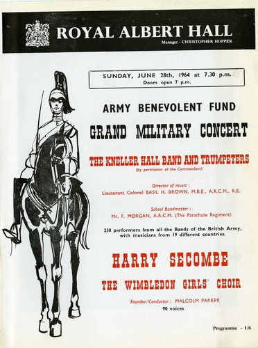 | Set List | 'A Fanfare For Heroes', Sir Arthur Bliss (Kneller Hall Band and Trumpeters), Grand March - 'The Spirit of Pageantry', Fletcher (Kneller Hall Band and Trumpeters), Overture - 'Light Cavalry', Suppe (Kneller Hall Band and Trumpeters), Medley - 'I Believe', Drake, 'World Without Love', Lennon, McCartney, 'Come Dancing', Anon., 'Climb Every Mountain' from Sound of Music, Rodgers (Wimbledon Girls' Choir, Michael Basset), Cornets - 'Buglers' Holiday', Anderson (Kneller Hall Band), Trombones - 'Tricky Trombones', Helyer (Kneller Hall Band), 'A Lightning Switch', Alford (Kneller Hall Band), Fanfare - 'Freedom', Morgan (Kneller Hall Band and Trumpeters), Martial Nostalgia - 'Passing of The Regiments', arr. Winter (Kneller Hall Band), 'Malbrough S'En Va-t-en Guerre', arr. Desportes (Kneller Hall Band), Excerpts - 'West Side Story', Bernstein (Wimbledon Girls' Choir, Kneller Hall Band), Band and Piano - 'London Fantasia', Clive Richardson (Student/Bandmaster B G Bogisch, Kneller Hall Band), Grand Finale: 'The Battle of Waterloo', Eckersberg (Kneller Hall Band and Trumpeters), 'Evening Hymn' and 'Last Post', arr. Tulid (Kneller Hall Band and Trumpeters), 'School March' (Kneller Hall Band and Trumpeters), 'God Save the Queen' (The National Anthem), arr. Gordon Jacob |