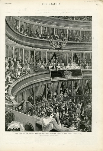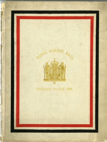 | Performance Notes | 'Punctually at 10, the Imperial party arrived , with an escort of the Blues. The Emperor and Empress were received by the Duke of Edinburgh, as President of the Council of the Albert-Hall, by the Earl of Lathom, the Earl of Kilmorey, Colonel Makins, Sir Lyon Playfair, Messrs T B Chappell and Ernest de la Rue. The Emperor and Empress were then conducted by the west staircase to the Queen's Room, which was decorated with flowers. Very soon the Royal Party were ready to enter, and the critical moment had arrived. "God Save the Queen" sounded and the Kaisermarch as the Royal party entered, while the whole audience rose to its feet as one man and looked in the direction of the Royal box. The Empress, who was ushered in by the Duke of Edinburgh in naval uniform, was dressed in scarlet and wore magnificent diamonds as a tiara and as a necklace. The Duchess of Edinburgh wore white and a tiara of diamonds. The Emperor looked extremely well and bright in the undress uniform of a British Admiral and had a pleasant expression on his face' (The Times, 10 July 1891) |