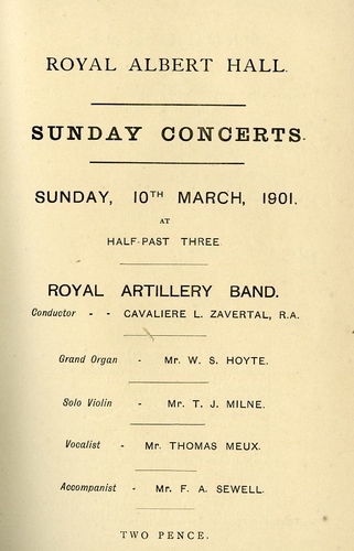 | Main Performers | Thomas Meux - vocal, W S Hoyte - organ T J Milne - violin |