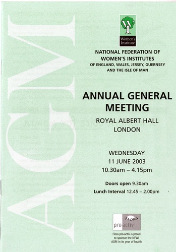 | Set List | 'Jerusalem', Parry Appointment of Returning Officers and Tellers, Adoption of Standing Orders, Chairman's Address, Hon. Treasurer's Statement, Adoption of Accounts and Auditors' Report, Appointment of Auditors 2003-2004, Adoption of Annual Review, Presentation of Lady Denman Cup, Resolution on Public Affairs Issues (Ordinary Resolution 1) - Children's Diets, Exercise and Health, Resolution on Public Affairs Issues (Ordinary Resolution 2) - Vocational Training of Young People, Guest Speaker (Amanda Ursell), Resolution on Public Affairs Issues (Ordinary Resolution 3) - Care of the Elderly, Constitutional (Ordinary) Resolution 4, Guest Speaker (David Mills), Result of Postal Ballot for Election of NFWI Board of Trustees 2003-2005, Guest Speaker (Dr Mike Stroud), 'Hen Wlad Fy Nhadau (Land of My Fathers)', 'God Save the Queen' (The National Anthem) |